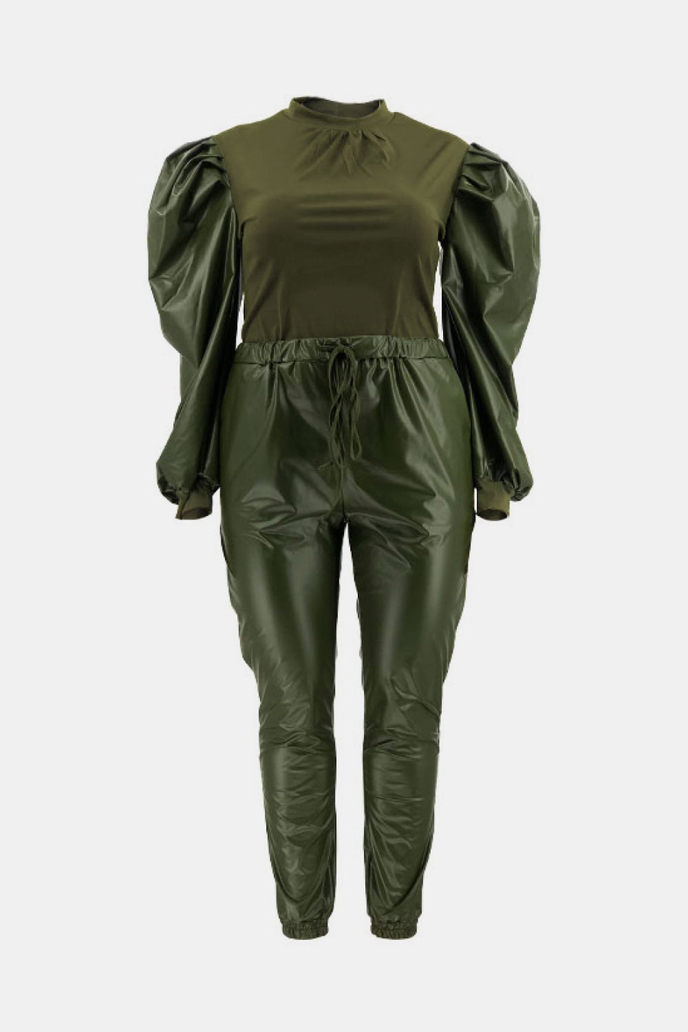 Plus Size Puff Sleeve Spliced Top and Drawstring Waist Joggers Set
